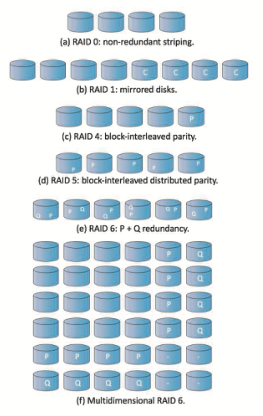 - 纠错计算结果放在第 N+1 个磁盘中,图中标有 P 的磁盘存储了纠错块