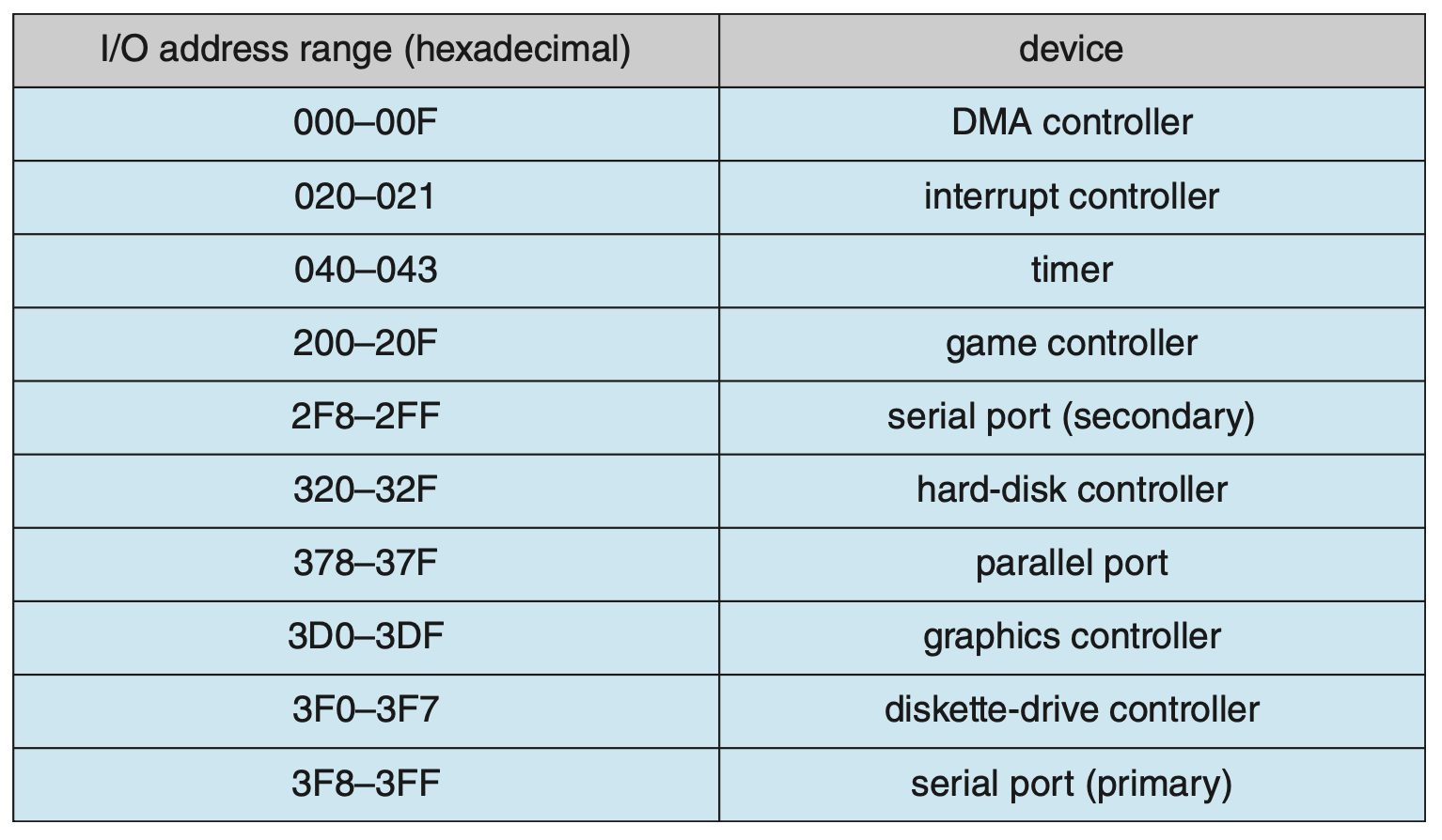 - CPU 使用标准的数据传输指令来读和写位于物理内存位置上的设备控制寄存器,从而执行 I/O 请求