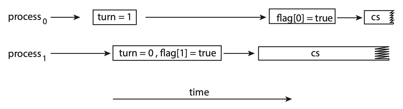 flag[0] == flag[1] == true - 这些意味着 \(P_0\) 和 \(P_1\) 不可能同时成功执行完它们的