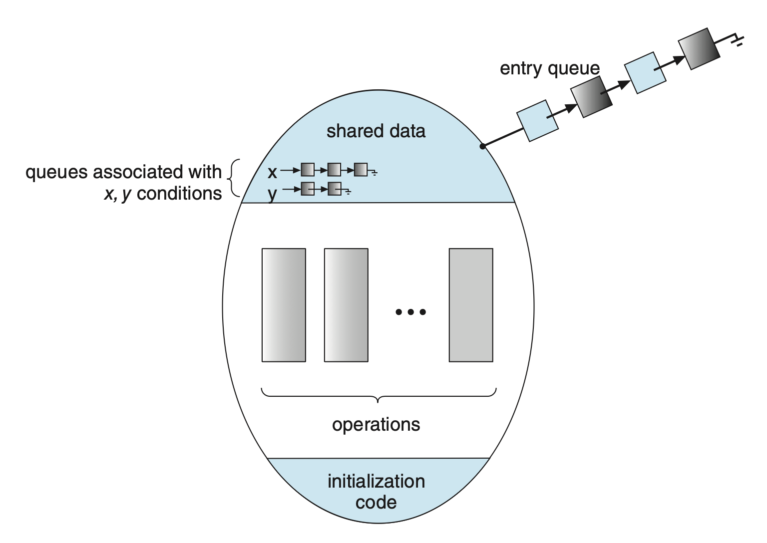 - 发信号并等待(signal and wait):P 要么等到 Q 离开管程,要么等待下一个条件